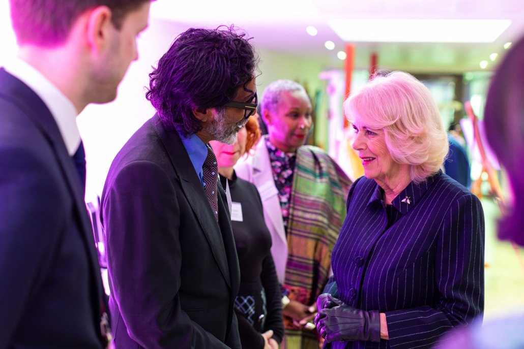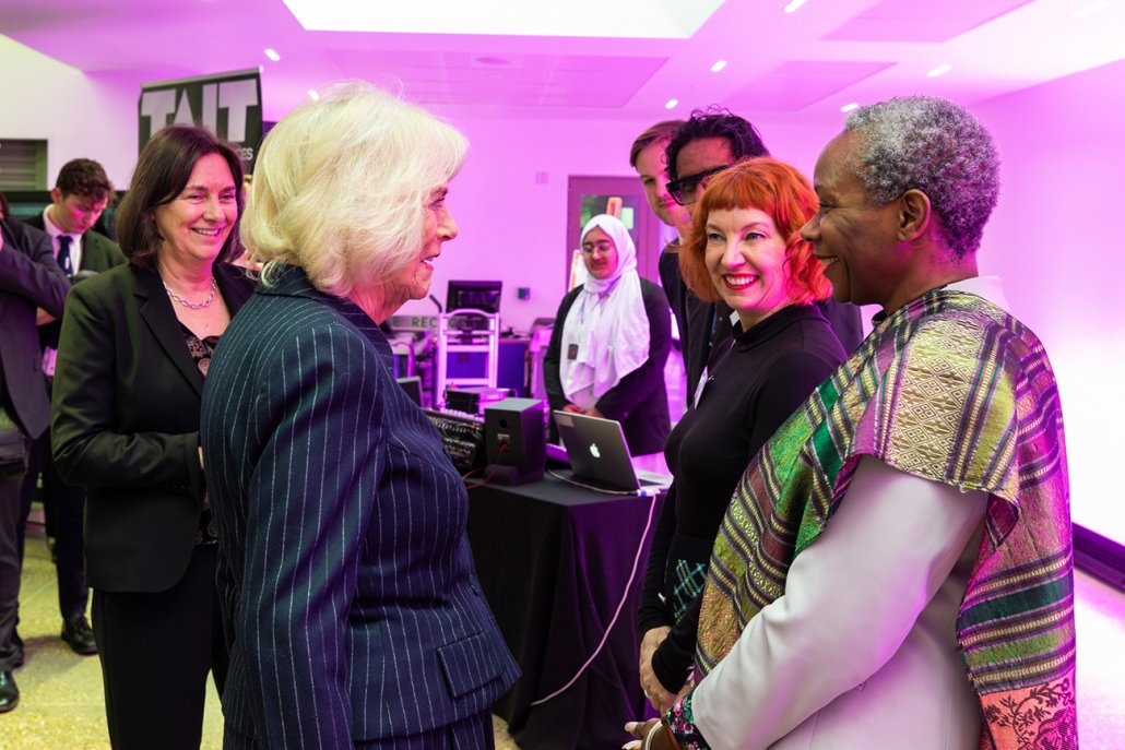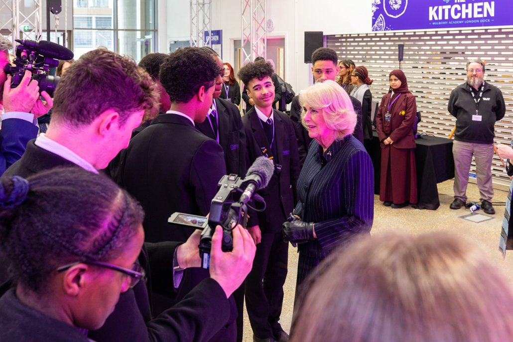 The visit continued with a tour of the Mulberry Production Arts Academy. This unique programme, delivered in partnership with the National Theatre and The Royal Central School of Speech and Drama, aims to discover, train, and empower students in technical and production arts. Her Majesty viewed the River Poem exhibition, a project commissioned for Mulberry Academy London Dock, the Genesis Theatre Design Programme based at Mulberry UTC, and student performances, including a song from Hamilton.