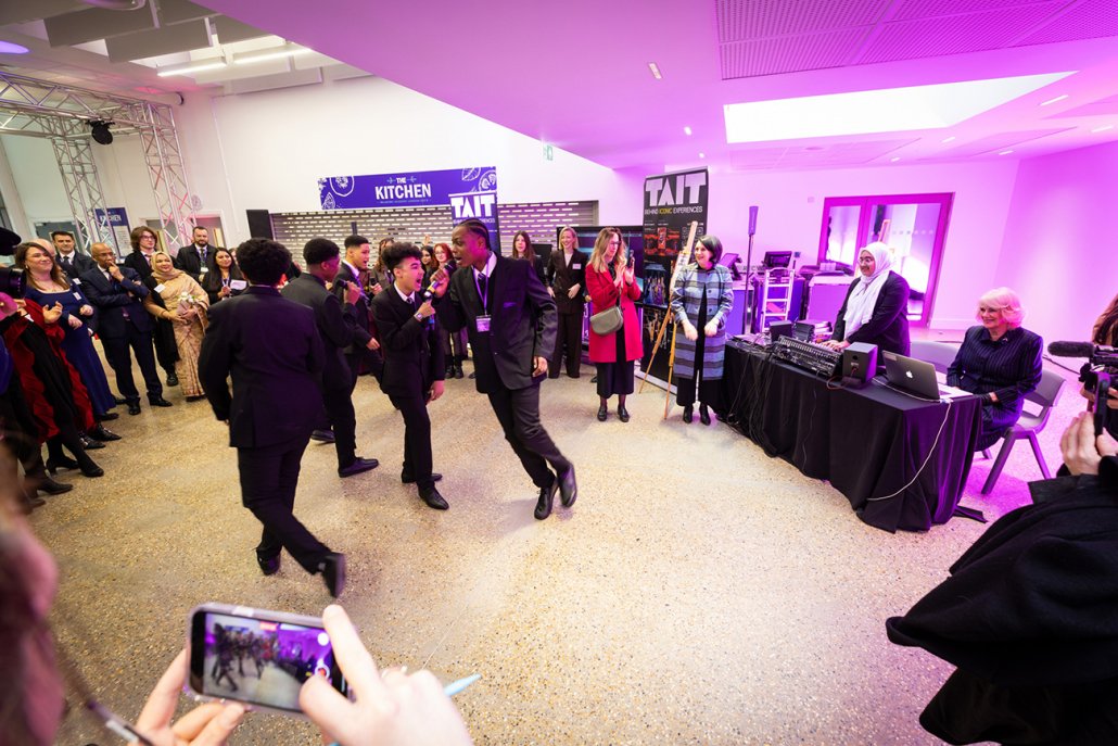 Her Majesty was warmly greeted by Deputy Lieutenant Morgan, Dr Vanessa Ogden, CEO of the Mulberry Schools Trust, Lutfur Rahman, the Executive Mayor of Tower Hamlets who secured the land for the school and provided financial investment, student representatives from each of the eight schools in the Trust, trustees, governors, key partners and community members. Local primary schools also joined Mulberry students and lined the entrance with flags, creating a vibrant and celebratory atmosphere.