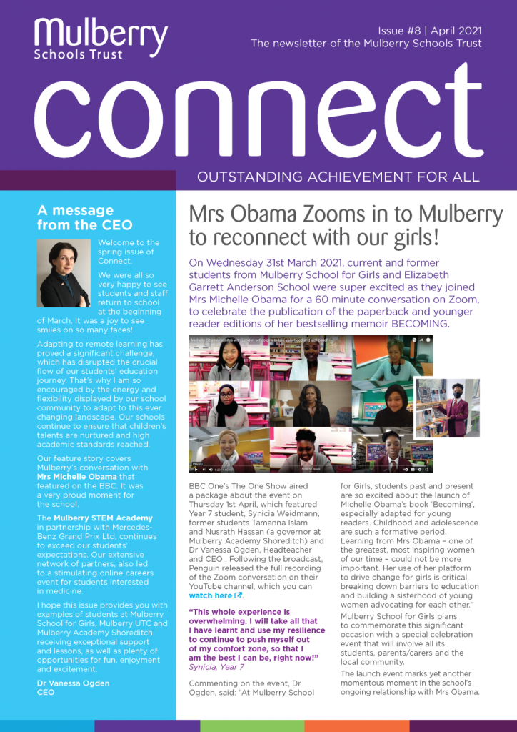 The feature story covers Mulberry’s conversation with Mrs Michelle Obama. The coverage featured on BBC One’s The One Show no less! We also have plenty of news and updates related to our brilliant Mulberry STEM Academy on page 3. This issue also provides many examples of the exceptional support and lessons provided by our schools, as well as opportunities for fun, enjoyment and excitement.