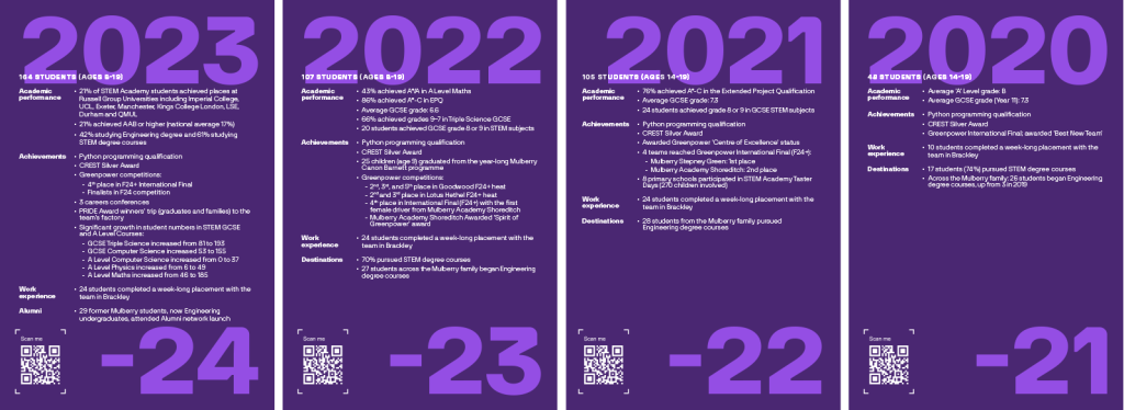 Each year’s card features a photo alongside key achievements and milestone moments, capturing the evolving opportunities and accomplishments of students across the academy. Together, they tell a powerful story of progression across four cohorts, reflecting the impact of hands-on STEM learning and the opportunities created through our partnership with Mercedes-Benz Grand Prix Ltd. The collection offers an inspiring snapshot of the young people driving the programme forward.